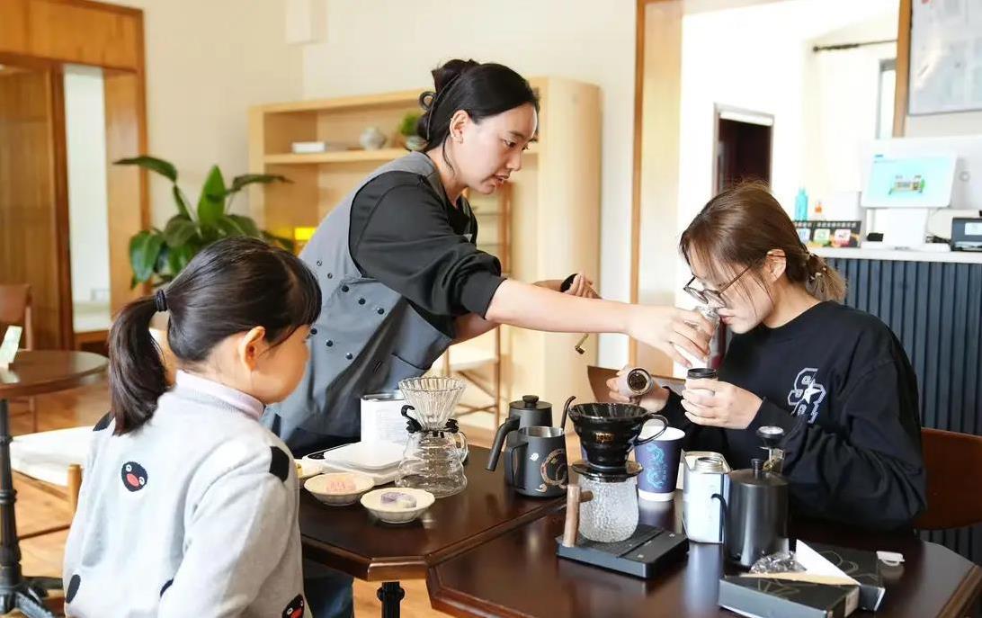 咖啡爱好者也找到自己的天堂。知鱼榭的咖啡品鉴沙龙,摆了几张桌子,游客围着学手冲咖啡。老师傅手把手教,怎么选豆、怎么冲泡,游客边喝边学,个个觉得自己能开咖啡店了。一位大姐笑着说:“平时喝速溶,今天才知道咖啡还能这么玩!”