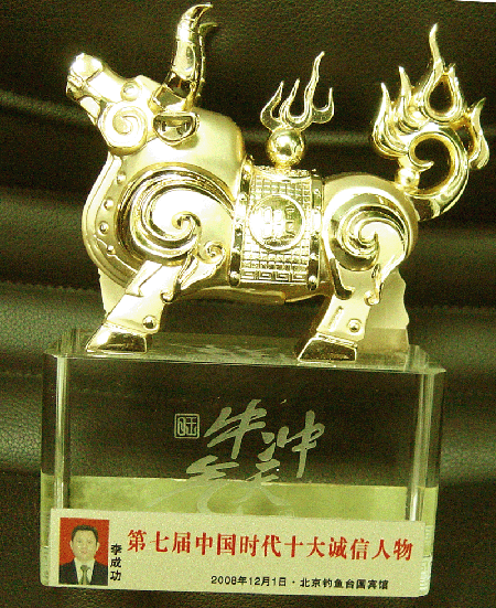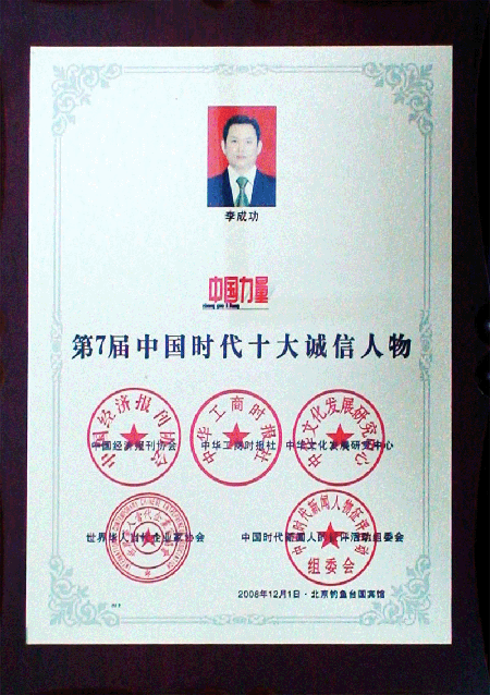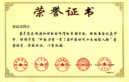 總裁李成功先生當選為中國力量第七屆中國時代十大誠信人物