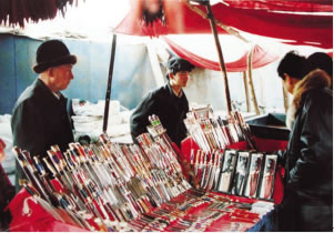 新疆出小刀的地方很多,其中有英吉沙小刀、莎車買買提折刀、伊犁沙木薩克折刀、和田墨玉奎雅折刀等。維吾爾族做刀的歷史悠久,由于工藝精湛,成為新疆的名牌產品。在眾多的小刀中,沙雅小刀以小巧玲瓏、裝飾精美而獨樹一幟。我們在這條街上欣賞到的小刀普遍只有一支香煙那么長(8-9厘米),最小的只有3厘米,如同絕美的藝術品,叫人愛不釋手。