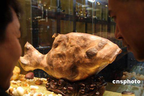 近日,北京愛(ài)家國(guó)際收藏品交流市場(chǎng)的一商戶(hù),展出一款來(lái)自新疆天山南部一干枯的湖底中發(fā)現(xiàn)的形似“魚(yú)”的罕見(jiàn)天然五彩奇石,形象逼真、色彩斑瀾,長(zhǎng)72.8cm、高33cm,重達(dá)20多公斤。此石被專(zhuān)家們譽(yù)為天下第一奇石,其價(jià)值約億元人民幣。展出3天以來(lái),吸引了不少中外收藏愛(ài)好者。