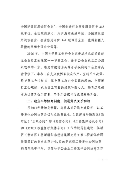 專報認為:新疆華春工會就是個例外。對內,建設規范有序、公正合理、互利共贏、和諧穩定的社會主義新型勞動關系,促進企業發展,維護員工權益,率先簽訂工資集體協商合同,勞資雙方高度和諧,實現企業與員工的雙贏,被自治區黨委、政府授予“模范勞動關系和諧企業”稱號;