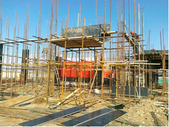 食堂為框架結(jié)構(gòu)二層,一層柱、梁、板施工完畢,二層框架柱鋼筋已綁扎完畢。