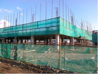 宿舍樓一、二層主體已施工完畢,正在砌筑三層磚墻