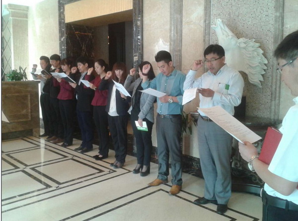晨會分為三大部分:首先從振奮人心的團隊口號開始,讓大家精神抖擻,一天都保有高昂的工作狀態;其次是工作目標的陳述,讓每一位員工明確每天的任務并為之努力完成;最后大家共同宣言,堅定信念,勢必要將營銷工作推向新的高度。