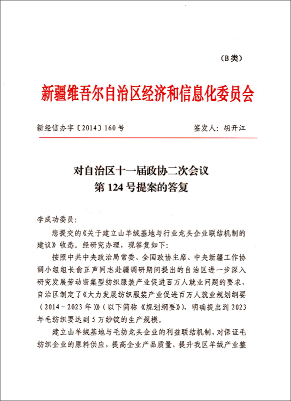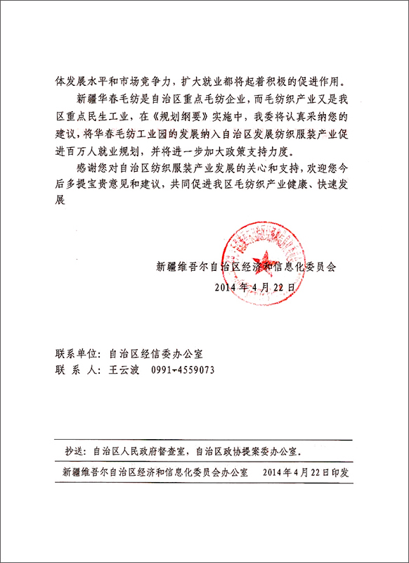 自治區經信委在4月22日印發的新經信辦字(2014)160號文件對自治區十一屆政協二次會議第124號提案的答復中,已明確了將華春毛紡工業園的發展納入自治區發展紡織服裝產業促進百萬人就業計劃,并將進一步加大就業政策支持力度。