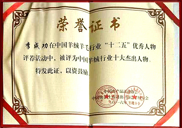 在3月28-30日中國畜產品流通協會第二十三屆全國絨毛會議上,李成功總裁以其在新疆羊絨紡織服裝產業的貢獻,榮獲“十二五”期間中國羊絨行業十大杰出人物稱號;作為行業龍頭的新疆華春毛紡有限公司榮獲“十二五”期間中國絨毛行業科技創新獎、“十二五”期間中國羊絨行業20強企業、2015年度中國羊絨行業綜合實力20強企業。