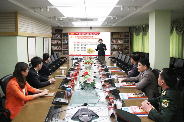 王獻斌大校一行首先參觀了華春集團文化中心,集團副總裁高青就華春企業(yè)文化的核心理念、主要產(chǎn)業(yè)、重大科研成果、發(fā)展戰(zhàn)略及前景、企業(yè)榮譽、社會責(zé)任等進行了介紹。在座談會上,高青重點闡述了華春企業(yè)文化的打造原則、以中華民族文化精華與現(xiàn)代意識相結(jié)合企業(yè)文化特質(zhì)的核心價值觀、企業(yè)文化主題理念、企業(yè)經(jīng)營理念及標志釋義等。雙方就如何深刻學(xué)習(xí)掌握國學(xué)傳統(tǒng)文化精華、在當(dāng)代社會增強各族人民對祖國的認同、對中華文化的認同、踐行社會主義核心價值觀的重要性等,進行了熱烈的討論交流。集團總助王錫輝與企業(yè)文化中心主任藍泰彬、陳旭虎、華春小貸工會主席趙瑜等管理人員參加了座談。