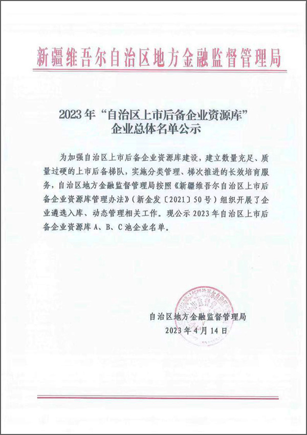 在華春集團迎來28周年華誕節的喜慶時刻,華春生物藥業又迎來重大喜訊——在自治區地方金融監督管理局于4月14日公布的2023年“自治區上市后備企業資源庫”名單中,新疆華春生物藥業股份有限公司連續名列資源庫A池企業名單。真是雙喜臨門,喜悅之情溢于言表!