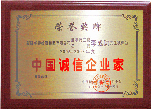 新疆華春集團總裁李成功先生經(jīng)中國誠信企業(yè)家評定組委會的初審、復(fù)審及公示,被評為2006-2007年度中國誠信企業(yè)家,于2008年剛剛開啟之際,為李成功先生頒發(fā)了榮譽證書和獎牌。