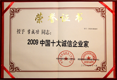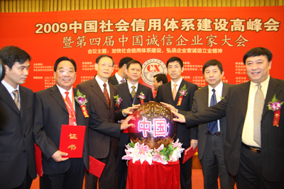 “企業信用評價AAA①級誠信企業”和“2009中國十大誠信企業家”獎項,是商務部研究院信用評級與認證中心依據國家有關法律法規,按照一定程序,集企業的債權債務管理、合同履行、公共記錄以及財務等信息,通過企業誠信評價模型進行科學評估出來的,旨在區分良莠、獎優罰劣,為我國企業參與國內外市場競爭創造必要的信用條件。信用等級由低向高依次為A級、AA級、AAA級、AAA①級。對信用等級達到A級以上的企業,商務部都要在國家級權威媒體上進行公示。