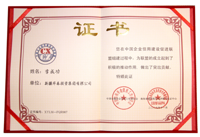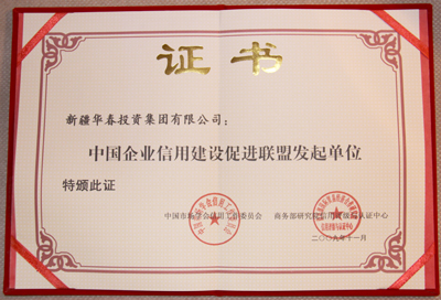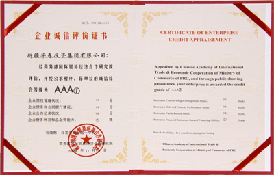 華春投資集團被評為最高信用等級即AAA①級的誠信企業,頒發了信用等級證書,并出具了信用等級評估報告。同時,華春投資集團被商務部研究院信用評級與認證中心定為中國企業信用建設促進聯盟發起單位,總裁李成功先生被定為中國企業信用建設促進聯盟發起個人。