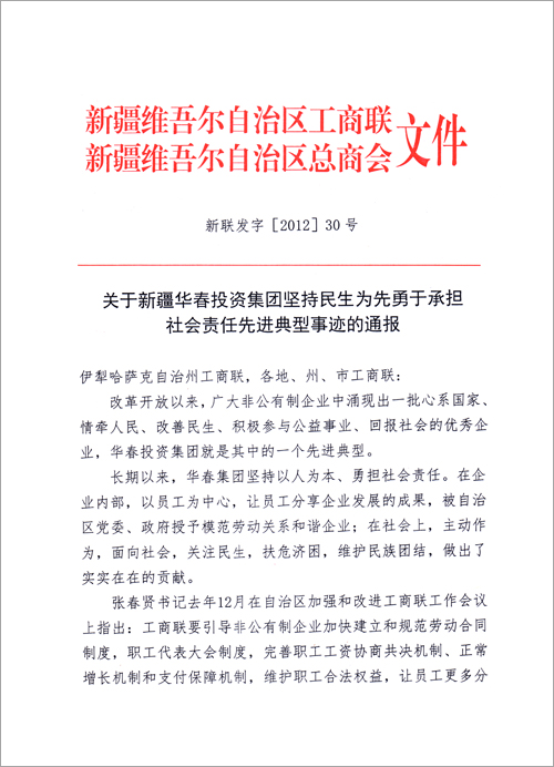 為引導全疆非公有制企業自覺履行社會責任,在保障和改善民生的實踐中發揮積極的作用,為政府分憂,為群眾解困。自治區工商聯(總商會)決定將華春投資集團堅持民生為先勇于承擔社會責任先進典型事跡通報全區工商聯。號召廣大非公有制企業和非公有制經濟人士向華春投資集團學習,自覺承擔社會責任,為保障和改善民生,為新疆的跨越式發展和長治久安做出應有的貢獻,以實際行動迎接黨的十八大召開。