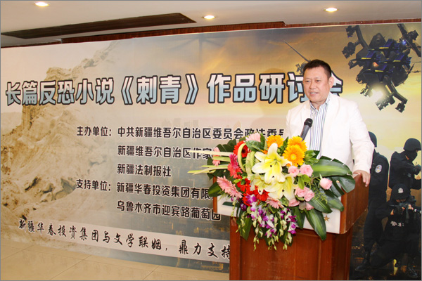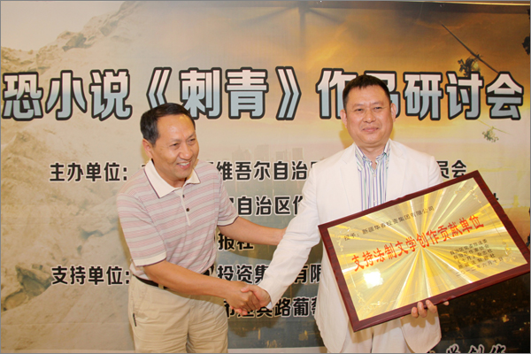由自治區(qū)黨委政法委、作家協(xié)會(huì)、新疆法制報(bào)社主辦的、由新疆華春投資集團(tuán)鼎力資助支持的法制文學(xué)創(chuàng)作“長(zhǎng)篇反恐小說(shuō)《刺青》作品研討會(huì)”,于2012年6月10日在鴻鑫酒店舉行。自治區(qū)黨委政法委授予新疆華春投資集團(tuán)為“支持法制文學(xué)創(chuàng)作貢獻(xiàn)單位”,頒發(fā)了獎(jiǎng)牌。新疆華春投資集團(tuán)李成功總裁、王春容董事與華春集團(tuán)統(tǒng)戰(zhàn)部、外事、工會(huì)的負(fù)責(zé)人參加了研討會(huì)。