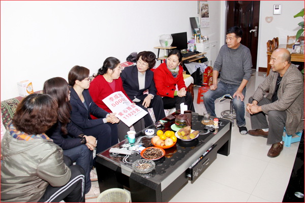 2012年10月17日,盡管季節已進入瑟瑟寒冷的深秋,但新疆華春投資集團的愛心捐款,為患病員工送去了溫情暖意。新疆華春投資集團工會主席高青與人力資源部、集團子公司華景物業及編輯部的管理人員一行,代表新疆華春投資集團李成功總裁和華春全員前去親切慰問患病的員工杜菊萍,當她接過李成功總裁和華春員工16925元的愛心捐款時,流下感動的淚水。杜菊萍的丈夫激動的一再說:“太感謝華春老總和華春人了,對一個基層員工還這樣的關心,太感謝、太感謝了!”