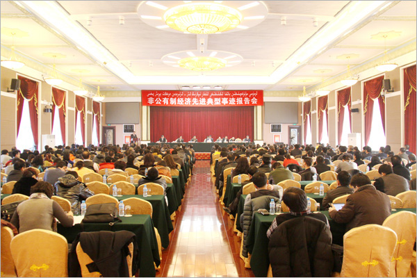 新疆隆重召開非公有制經濟先進典型事跡報告會--新疆華春集團有限公司李成功總裁在會上報告先進典型事跡
