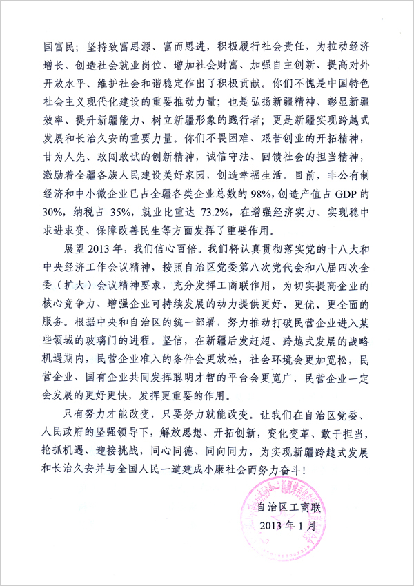 2013年1月17日,自治區工商聯黨組成員、自治區工商聯副主席努爾力•尤努斯和自治區工商聯光彩辦副主任陳風玫一行2人,春節前代表自治區工商聯主席及黨組來華春投資集團慰問企業家副會長李成功總裁并送上自治區工商聯黨組的慰問信和鮮花。
