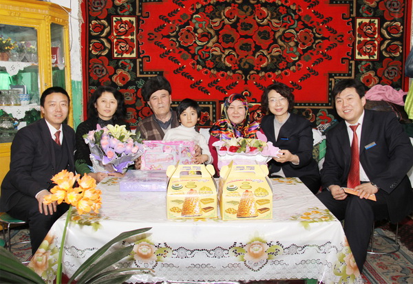 3月7日,華春投資集團工會主席高青一行帶著鮮花和慰問品,特意看望了阿里木•阿吾東父母及妻子、孩子。