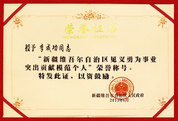 6月18日,在自治區隆重召開見義勇為英雄模范表彰大會上,新疆華春投資集團總裁李成功被授予為自治區見義勇為事業作出突出貢獻的模范,與3名見義勇為英雄、2個見義勇為英雄群體和13個為自治區見義勇為事業作出突出貢獻的模范單位與個人一起受到表彰獎勵。