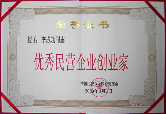 “優(yōu)秀民營(yíng)企業(yè)創(chuàng)業(yè)家”榮譽(yù)證書